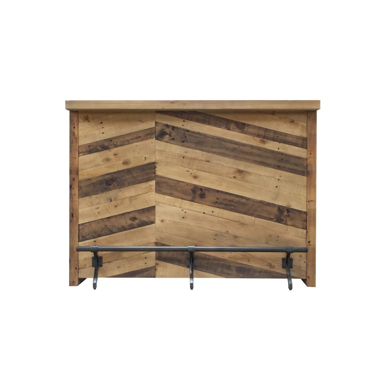 This beautiful Apollo wood bar has a simple and rustic design, adding a urban farmhouse element to any room. The reclaimed pine wood frame and iron footrest accent makes it as beautiful as it is functional.