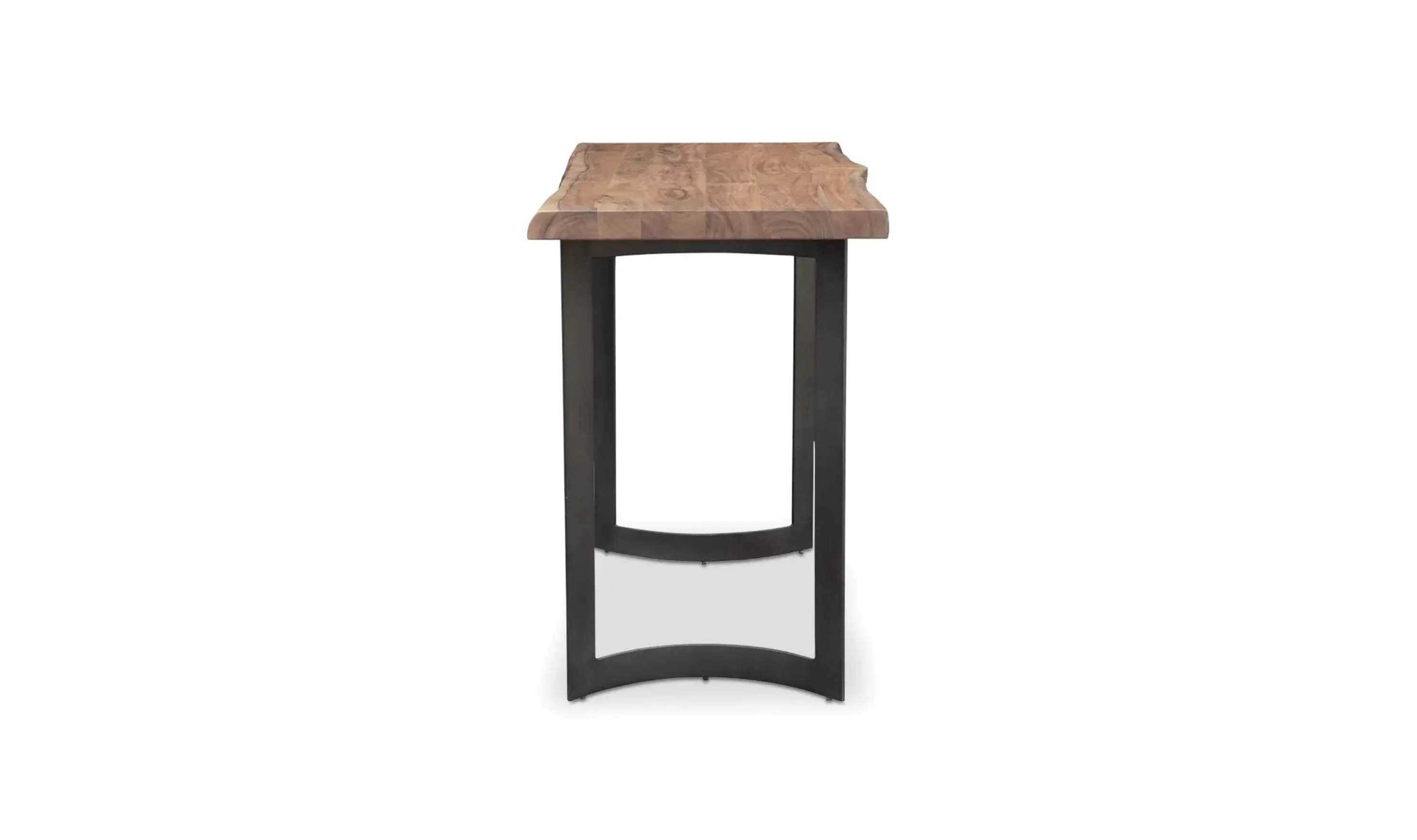 The Bent bar table is expertly crafted from solid acacia, featuring live edge detailing that highlights the unique knots and whorls of the wood. Its water-based finish lends it a rustic ambiance while the sturdy iron legs, finished in gunmetal, complete the design with a tasteful touch. Place the bar tabletop in any living space for a stunning display of natural beauty.