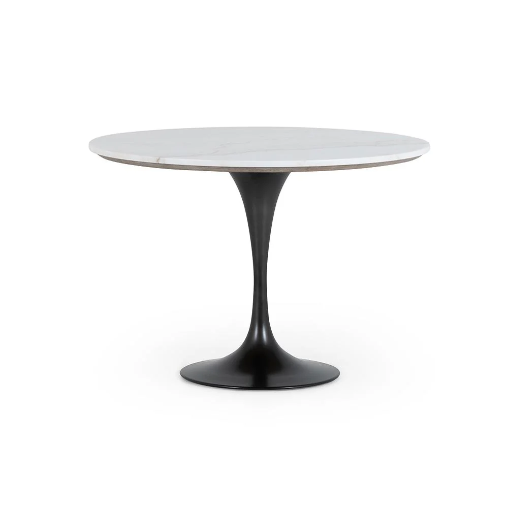 The modern tulip shape of this table is redefined in an industrial style with a cast-iron black base. The Powell Bistro Table is available in 3 sizes and 4 varying materials, so you can customize to the needs of your space!